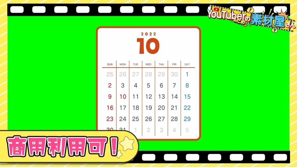 Write an article about 【無料動画素材】エフェクト_カレンダー2022年10月,カレンダー,こよみ,日付,2022年10月,フリー素材,フリー動画素材,グリーンバック【商用利用可】 in 400 Japanese characters