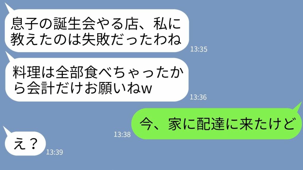 Write an article about 【LINE】息子の誕生日に予約した高級レストランに先回りして全て食べ尽くしたアフォママ一家「早く金持ってきてw」→会計だけ任せてくるDQN女に真実を伝えた時の反応がwww in 400 Japanese characters