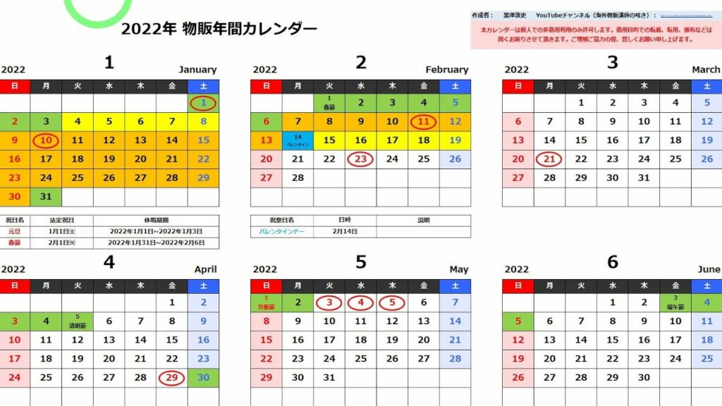 2022年【物販カレンダー】無料ダウンロード↓