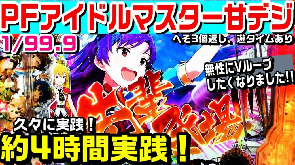 Write an article about PFアイドルマスター甘デジ!!久々に約4時間実践!!Vループ獲得期待度約48%!! in 400 characters Japanese